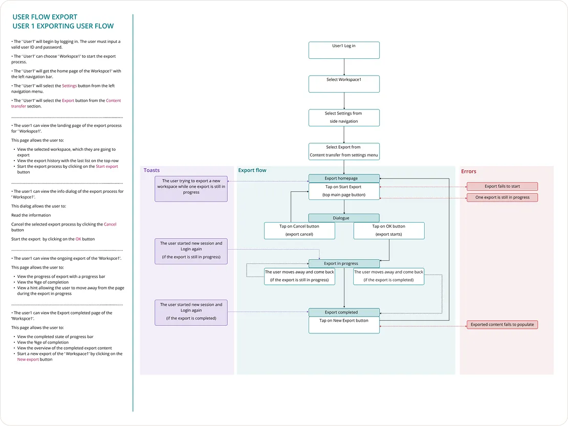 The user should be able to start the export process easily and receive relevant information about the export, including its purpose and contents.