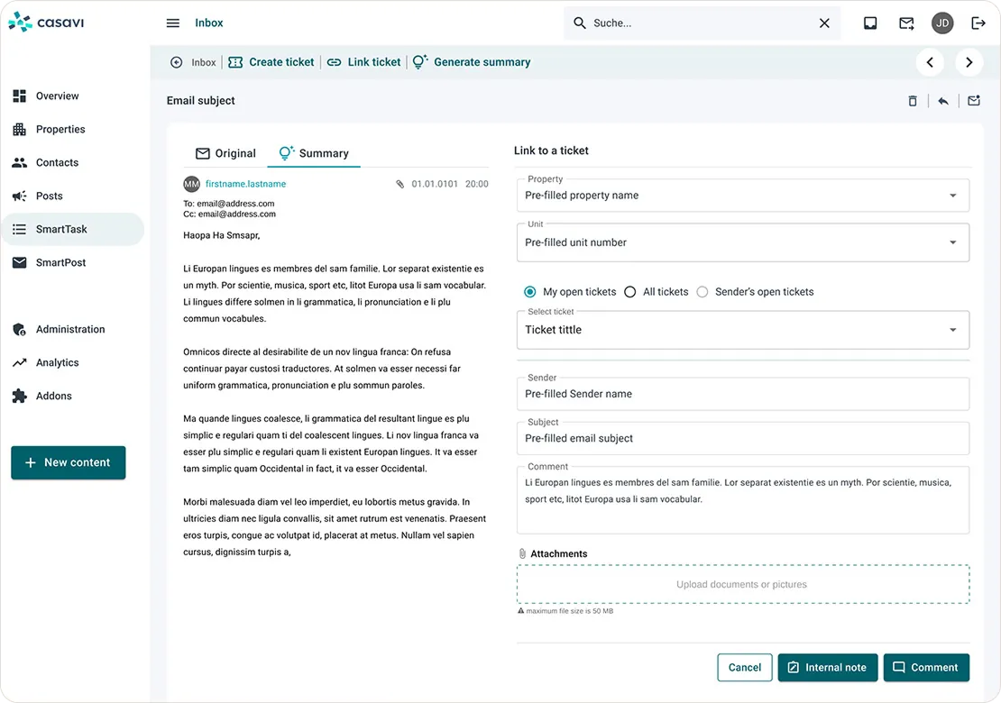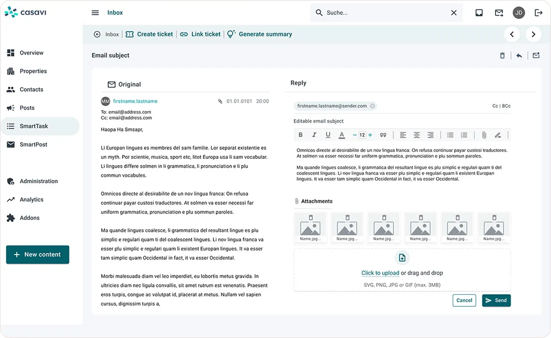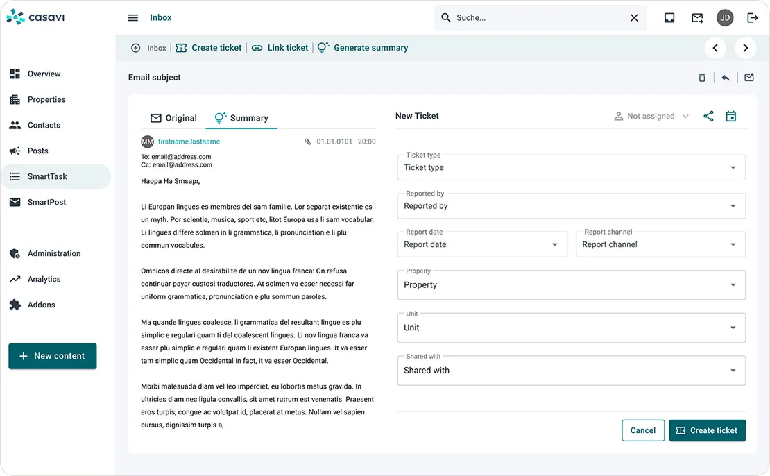 SmartTask Integration: Integrate email traffic and calendar functionality into the smarttask ticket system, enabling the creation and assignment of tasks and tickets from emails, as well as centralizing correspondence within casavi.